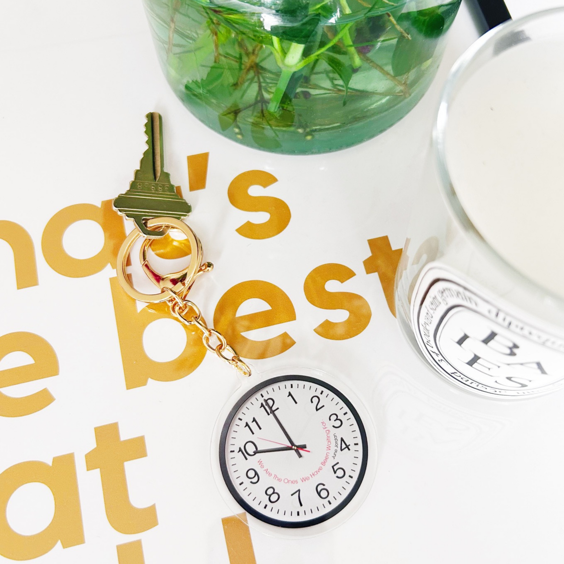 Make a quiet statement with powerful meaning. This double-sided acrylic keychain features a vintage-style clock illustration and the iconic quote by poet and activist June Jordan.